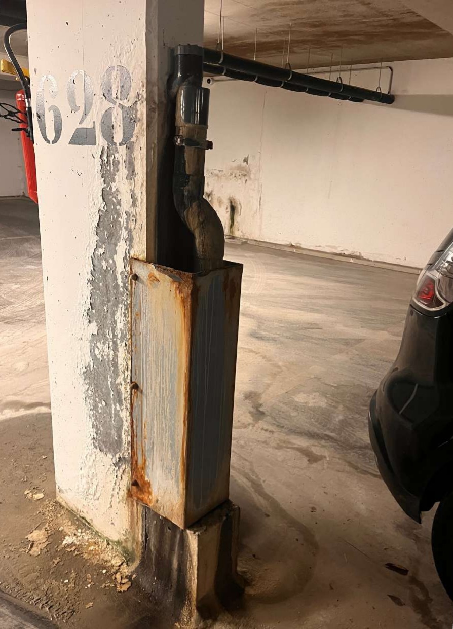 Renforcement du plancher bas du parking en sous-sol, réfection des joints de dilatation de la dalle, reprise des fissures et drainage des eaux, mise en œuvre d’une cristallisation toute hauteur et d’évents, puis mise en peinture et divers travaux embarqués comme ceux de chauffage (chaudière), en site occupé. Chantier par phase pour assurer les services essentiels aux occupants.